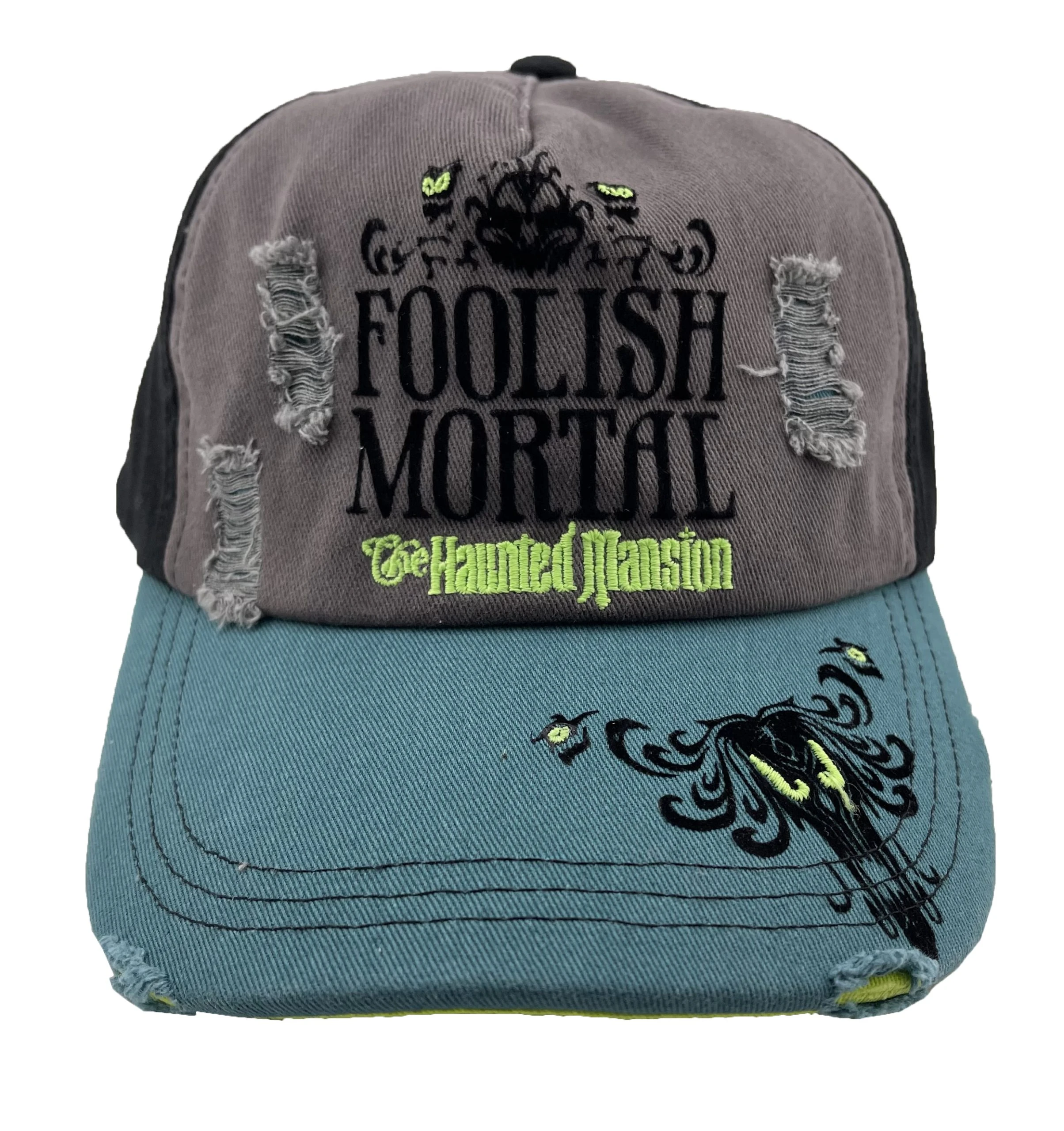 Welcome Foolish Mortals! This fun Baseball Cap Features a distressed look that says Foolish Moral and Haunted Mansion Logo.